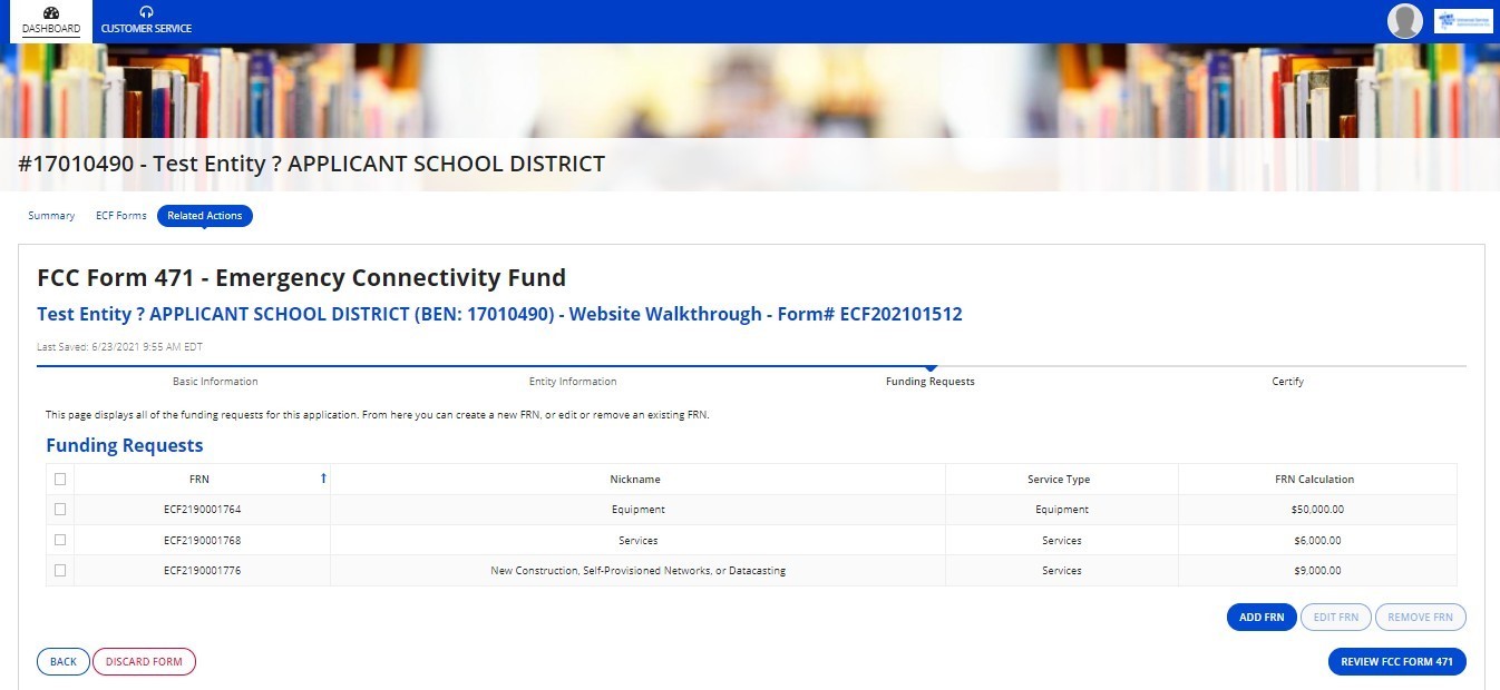 - After all your FRNs have been added, you are now ready to review and certify your form. Select Review FCC Form 471 and proceed below to Certify section for next steps.
