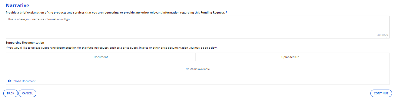 - Under Narrative, provide a brief explanation of the equipment that you are requesting, or provide any other relevant information regarding this Funding Request.